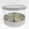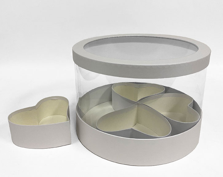 | FEATURE: | PVC transparent round shape flower box. Clear lid and 4 hearts are removable . Waterproof with laminated surface internal and external. However, It is not design to hold water without a liner. |