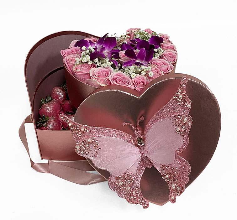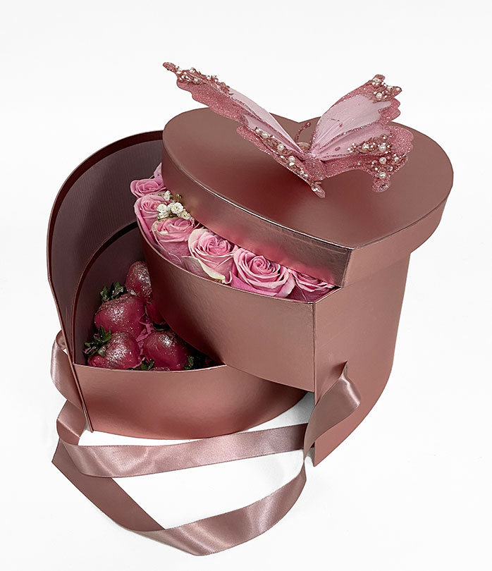 | FEATURE: | Darling two-tiered, heart-shaped flower box design that opens into a cascaded display. Waterproof with both internal and external laminated surfaces. Not designed to hold water without liner. |